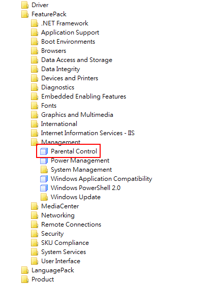 在Answer File下,將FeaturePack→Management下,”Parental Control”這組Package移除