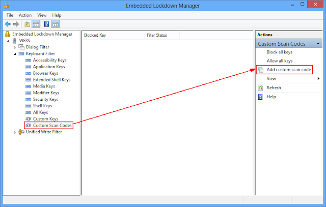 - 另外,當使用的鍵盤非一般使用的標準鍵盤,則可透過Custom Scan Code的方式來禁止,首先移至”Custom Scan Code”,並點選Actions下方”Add custom scan code”