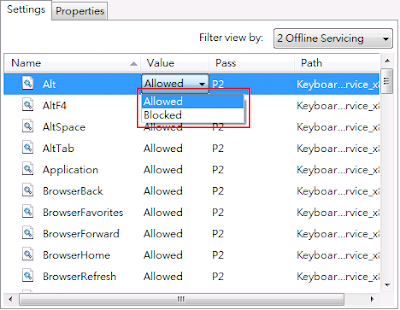 - 接著選取要設定的Key,假設這邊要禁止”Alt”功能,選取”Alt”,並在Value的欄位使用下拉選單,將”Allowed”調整為”Blocked”就可以了,這麼一來build好的image,Alt就無法使用了